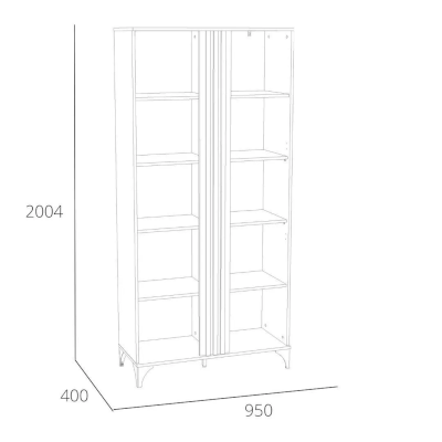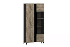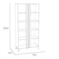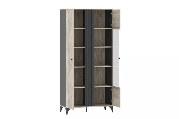 Шкаф оснащен двумя распашными дверьми с полками для хранения вещей. За фасадом из закаленного стекла можно расположить посуду, книги или элементы декора, а высокие опоры обеспечивают быстрый и легкий доступ во время уборки. Сборка шкафа универсальна – фасад-витрина может крепиться как на правую, так и на левую стороны.