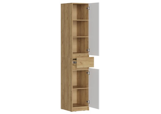 Шкаф КВИК-СТЕП ШК-002 идеально впишется в любой интерьер, будь то скандинавский стиль, минимализм или лофт. Сочетание текстуры дерева "Дуб Крафт золотой" и белых фасадов "Белый шагрень" придают шкафу элегантный и лаконичный вид.
